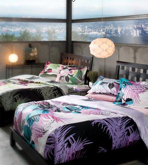 大网印花设计,采用127*79 260根全棉缎纹,手感柔软,光泽感强,大胆强烈的对比色使用,使该产品更具时尚感,图案花型也非常符合热带风情的元素。